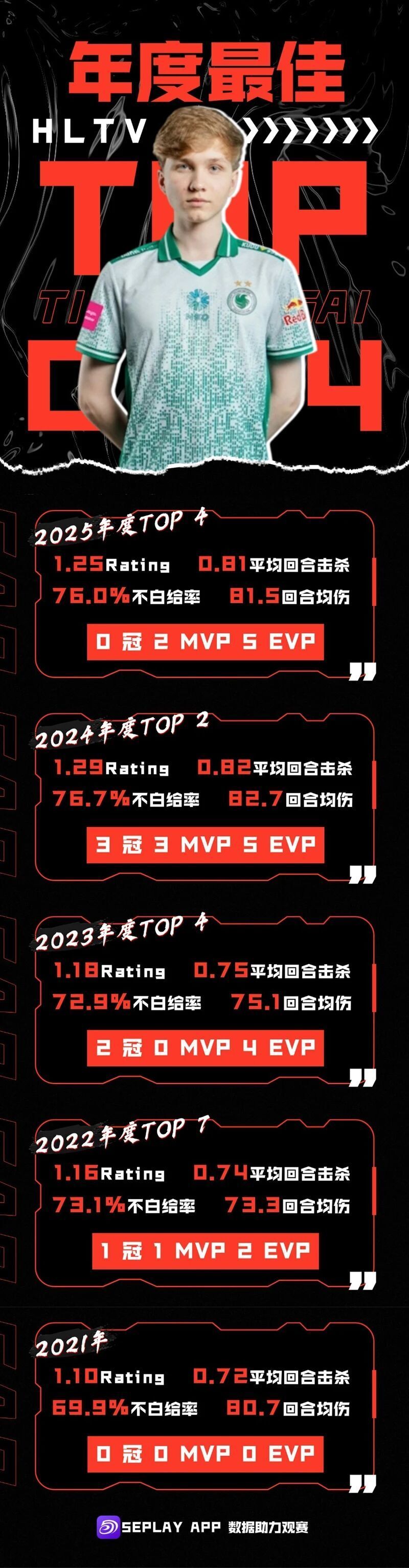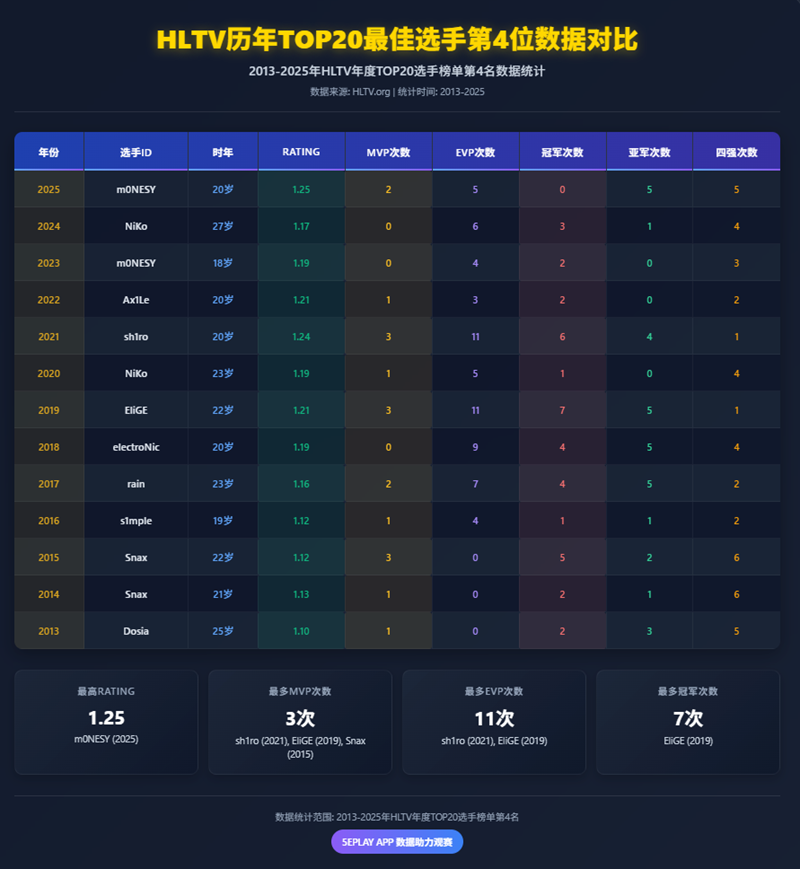 今日凌晨,HLTV正式公布了2025年度最佳选手TOP4,来自Falcons的m0NESY以1.25的Rating,2次MVP、5次EVP、5次大赛亚军、5次四强的成绩位列今年榜单的第4位。