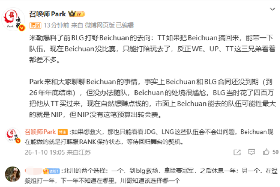 由此可见,北川目前只能等,等哪个战队第一赛段垮台,他再去救火,就还能回归赛场。Park这边则是爆料,北川和BLG的合同其实还没断,需要在26年底才到期。当初从TT将北川买过来时,花了四百万,BLG现在还是想赚一点回来的,所以也在盼着北川转会入队,自己可以从中赚一笔回来。但市场上的队伍中,NIP算是可能性最大的,可NIP却没有这一笔预算出这个转会费,所以没办法,北川就只能待业。这段时间需要自行通过韩服rank保持手感,观望回归LPL救火的机会,失去了主动选择的机会。