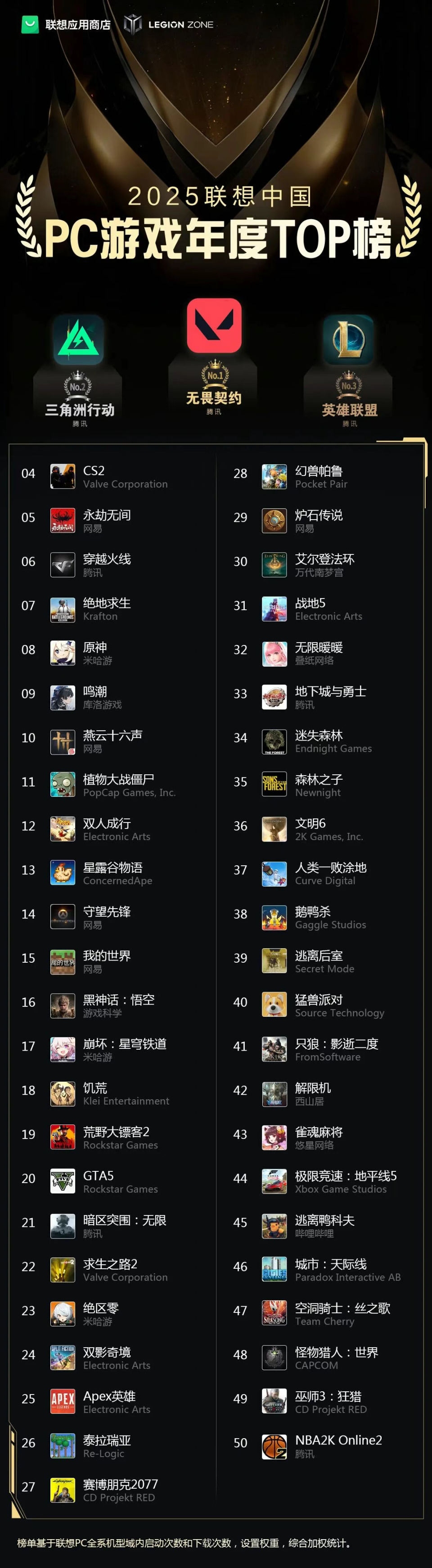 2025联想中国PC游戏年度TOP榜现已正式发布,无畏契约,荣登榜首!