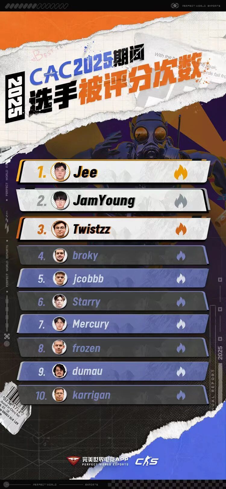 与此同时,我们也整理了裂变天地S1、CAC 2025、奥斯汀Major与布达佩斯Major时期,选手的被评分次数榜单。快来看看你当时的都给哪些选手打了分?