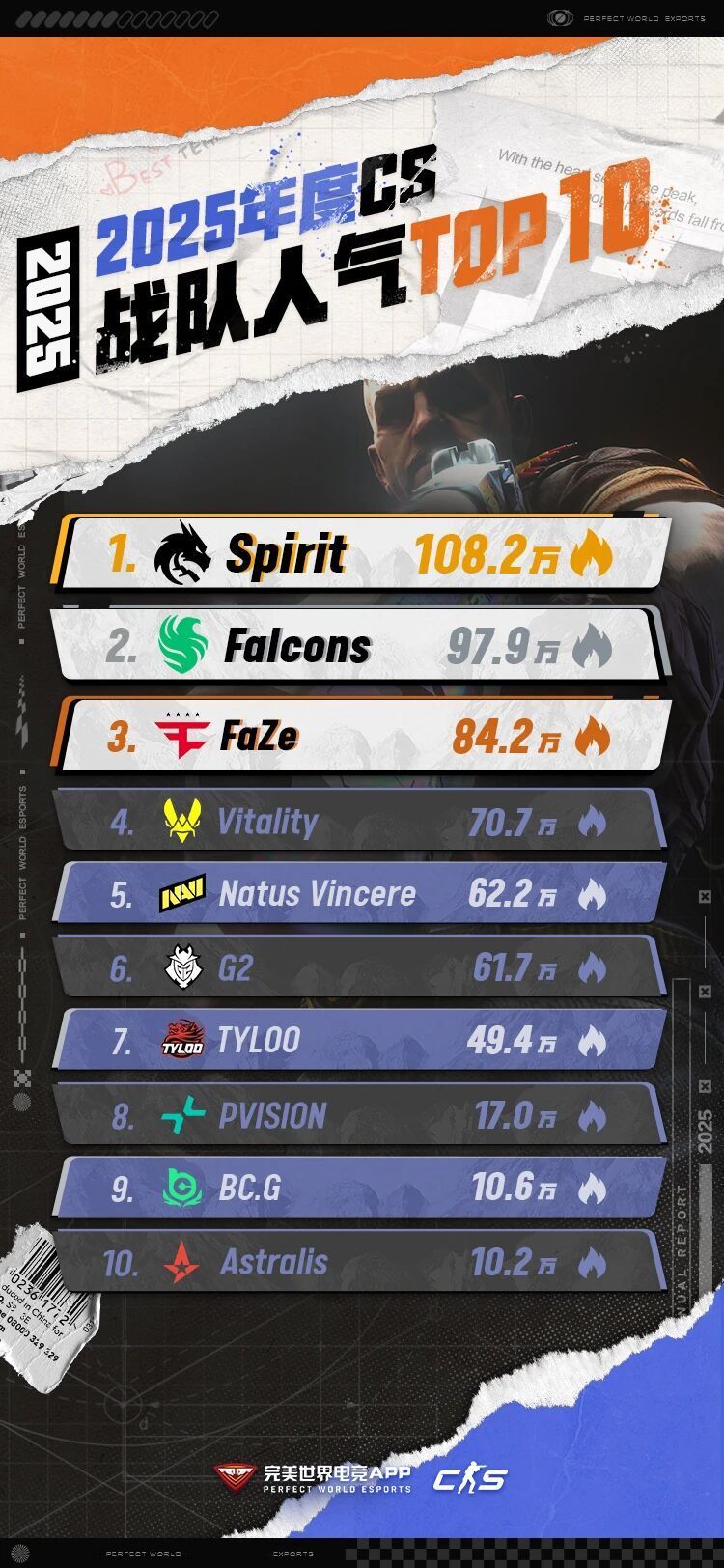 迈入2026年,我们整理了各位玩家去年在完美世界电竞APP里留下的印记,其中最为显眼的当属队伍与选手们的热度数据。因此我们将排名前十的队伍与选手人气值罗列至此,供各位参考。