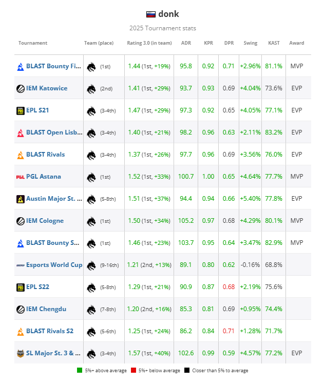 这位俄罗斯天才的年度数据堪称离谱,以至于要列举他没有排在第一的数据项反而会更容易一些——不过即便如此,结论依旧是令人震撼的:在所有赛事级别(Major、超级精英赛事、精英赛事、大型赛事以及全年整体)中,donk的Rating均高居榜首。在面对所有强度层级的对手(TOP5、TOP10、TOP20、TOP30、TOP50)时同样如此;无论是在小组赛、淘汰赛、场馆,还是精英级淘汰赛阶段,donk也始终保持着第一的位置。