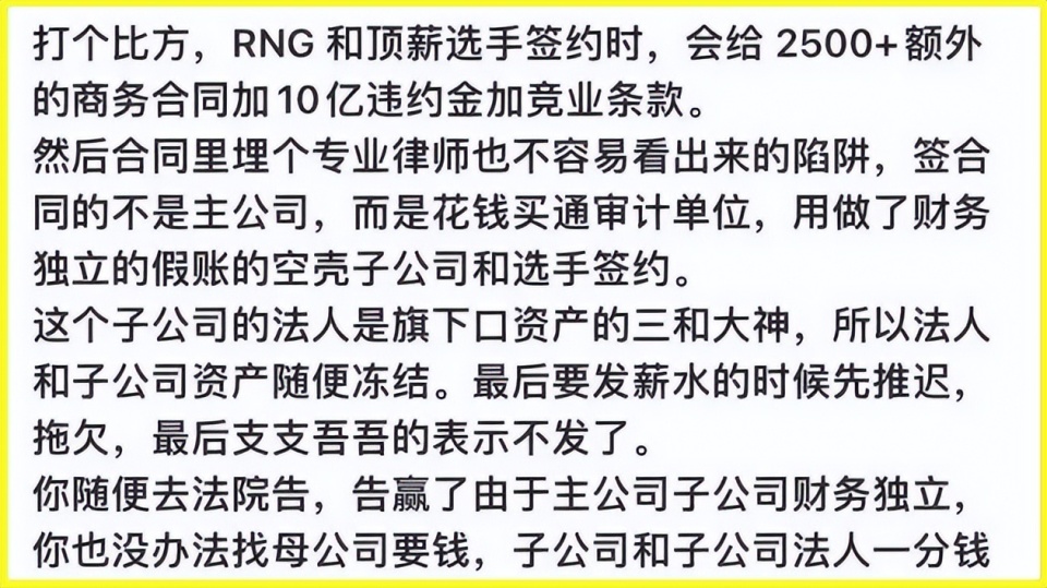 RNG被LPL官方除名之后,最近的口碑一落千丈,有自称业内人士的网友,近日爆料了RNG,卡合同的套路,在签约选手的时候,RNG会给出额外的商务合同,外加竞业协议和一个10亿的违约金,合同里埋了专业律师,都看不出来的陷阱,最抽象的是跟选手签约的,是RNG的空壳公司。