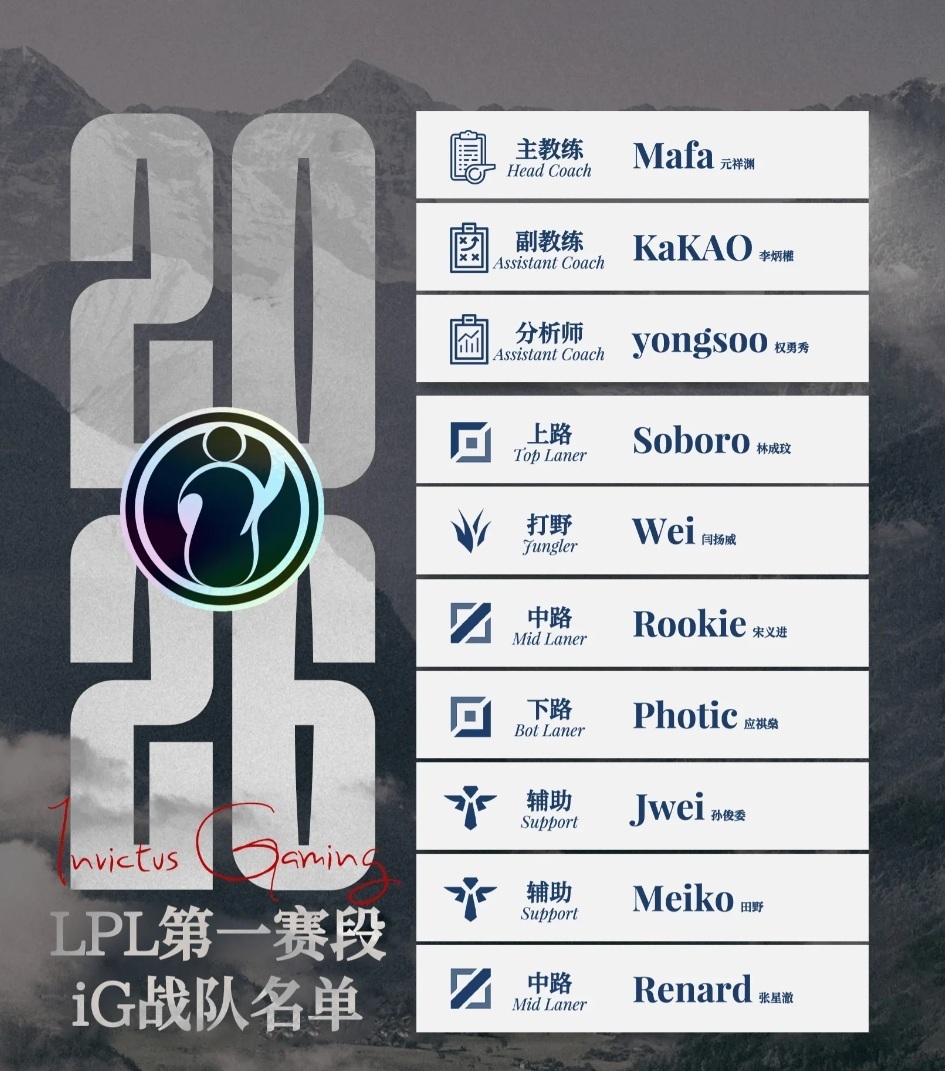 结果IG最新官宣的新赛季人员大名单中,Rookie就出现在了首发的位置,而小中单Renard则在替补席的位置,新赛季也有登场机会。