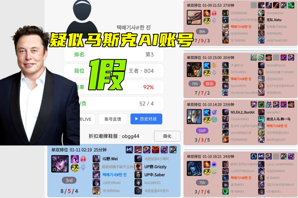 就在近期,一个韩服新号以95%的胜率成功登顶韩服第一,目前的战绩为52胜4负,胜率跌落至了92%,但就算是如此,如此的胜率也被视为“远非人力”可以达成。并且还有玩家研究了他的rank时间,准时从中午12点开打,打到凌晨两点半准时下线,中间根本没有休息,都是打完就开,这种规律持续了好几天,根本不像人类可以抗住的。毕竟人类是需要休息和进食的,就算不吃饭不休息,中途上个厕所也是难免的。因此,在多数玩家的猜测中,此账号被挂上了“马斯克AI”的标签。
