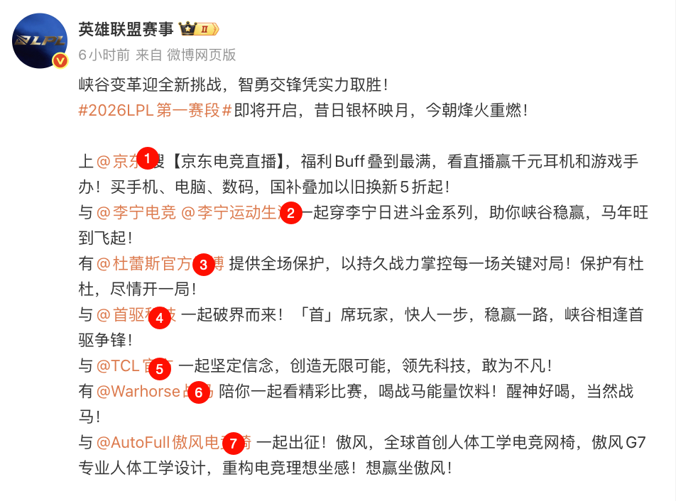 LPL官方在今天公布了2026赛季的7家赞助商名单,与去年相比,的确在数量上有所减少,由原来的10家缩减到了7家,这7家包括京东、李宁、杜蕾斯、首驱、TCL、战马、傲风。