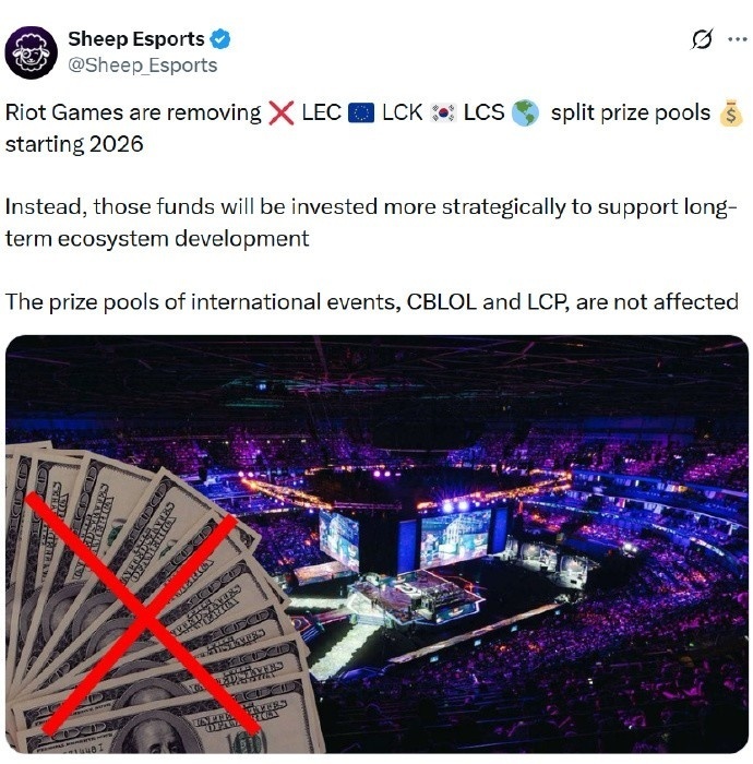 这里所说的比赛奖金取消是拳头在前不久刚刚官宣的一件事,大致的内容就是除了LPL赛区之外,拳头2026年将取消全球收入共享池(GRP)的分赛区奖金池;这一点在LCK赛区的最新规则手册中也有提到,不过LCK仍保留了常规奖项(比如一阵选手,联赛MVP等)但不见奖金。