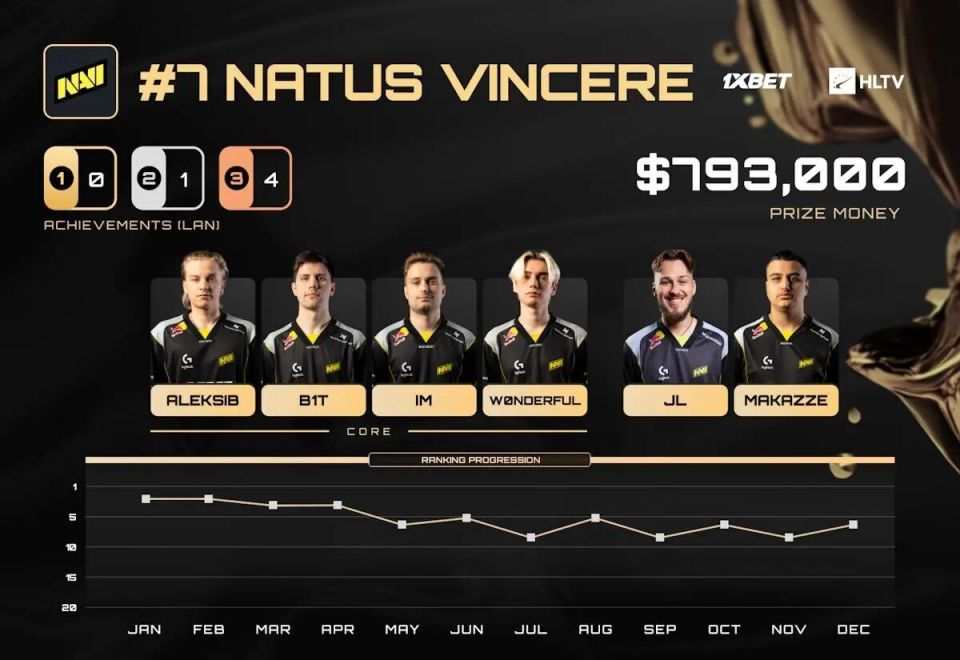 NAVI在2024年度过了一个极为成功的赛季——他们不仅赢下了一届Major的冠军,还额外收获了三项重量级赛事的奖杯。不过NAVI在2025年的上半年依旧稳定地保持在顶级行列之中:他们只在一项赛事中无缘淘汰赛,并在IEM卡托维兹与BLAST赏金赛中闯入四强。再加上在BLAST奥斯汀Major成功打进决胜赛,印证着这支NAVI虽然不再像2024年的某些时刻具备统治气质,但仍然是一支精英队伍。