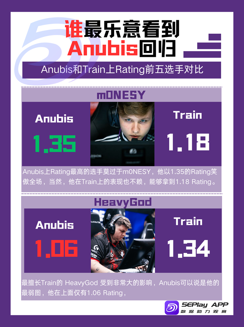 而另一边,最擅长Train的HeavyGod受到非常大的影响,Anubis可以说是他的最弱图,他在上面仅有1.06 Rating,Passion UA的Grim同样如此。b1t在Anubis上的挣扎同样明显,但这对Natus Vincere的影响如何还要看具体情况。