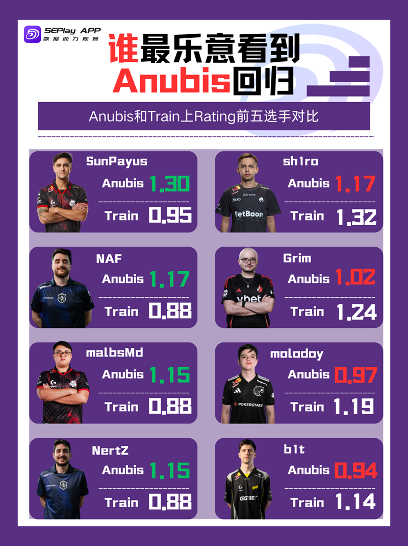 前几日,V社官宣了Anubis替换Train的决定,Anubis将会在今日开打的BLAST赏金赛S1 2026上正式登场。这一地图池的更换对谁更有利呢?又是哪支队伍大受影响?国外媒体对Anubis和Train上Rating前五选手进行了对比,一起来看看吧!