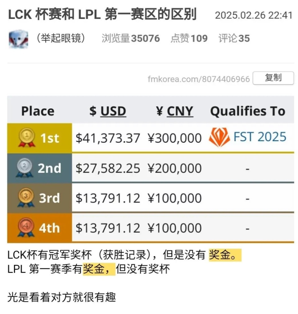 实际上在去年LCK赛区第一赛段是有冠军的头衔但是没有奖金拿,而LPL赛区第一赛段的赢家被称之为优胜者,没有冠军的头衔,但有奖金拿。