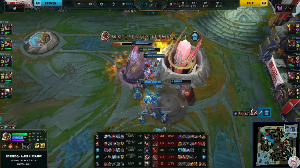 DNS全位置碾压KT,上中下野四人挂着赏金,结束时接近1万的经济差距。这场LCK2026年的揭幕战第一局比赛,算是大爆冷了。