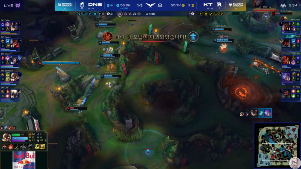这场LCK新赛季的第一场比赛,在赛前自然是看好KT的更多。DNS中单换成了Clozer,双人组就是去年KT的deokdam和Peter,而KT自己则是重新招募了Aiming和新人辅助Pollu以及转型辅助复出的Ghost作为新下路组合。原以为KT在BDD为首的上中野不变的情况下,应该会比DNS表现更好,结果没想到上中野反而是被打穿最厉害的位置。