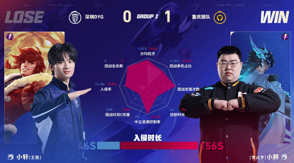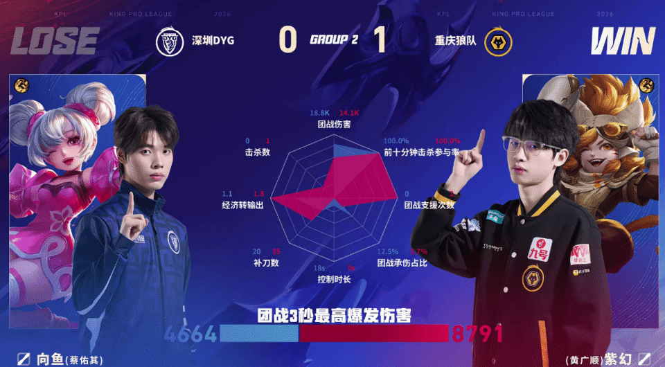 虎扑01月14日讯 狼队/DYG第一局数据对比:小胖和归期上野组合数据包围对位