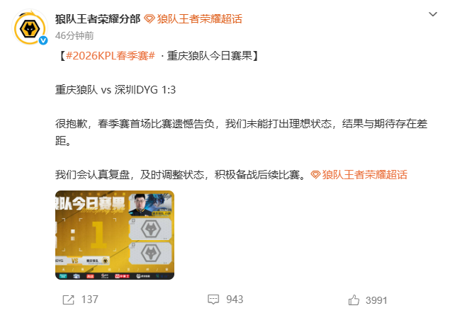 在后续的两场比赛中,DYG老选手钎城持续发力,孙尚香+李元芳都给到了狼队巨大的压力,就这样,这场属于两队的春季赛首秀,以DYG3:1狼队为结尾。