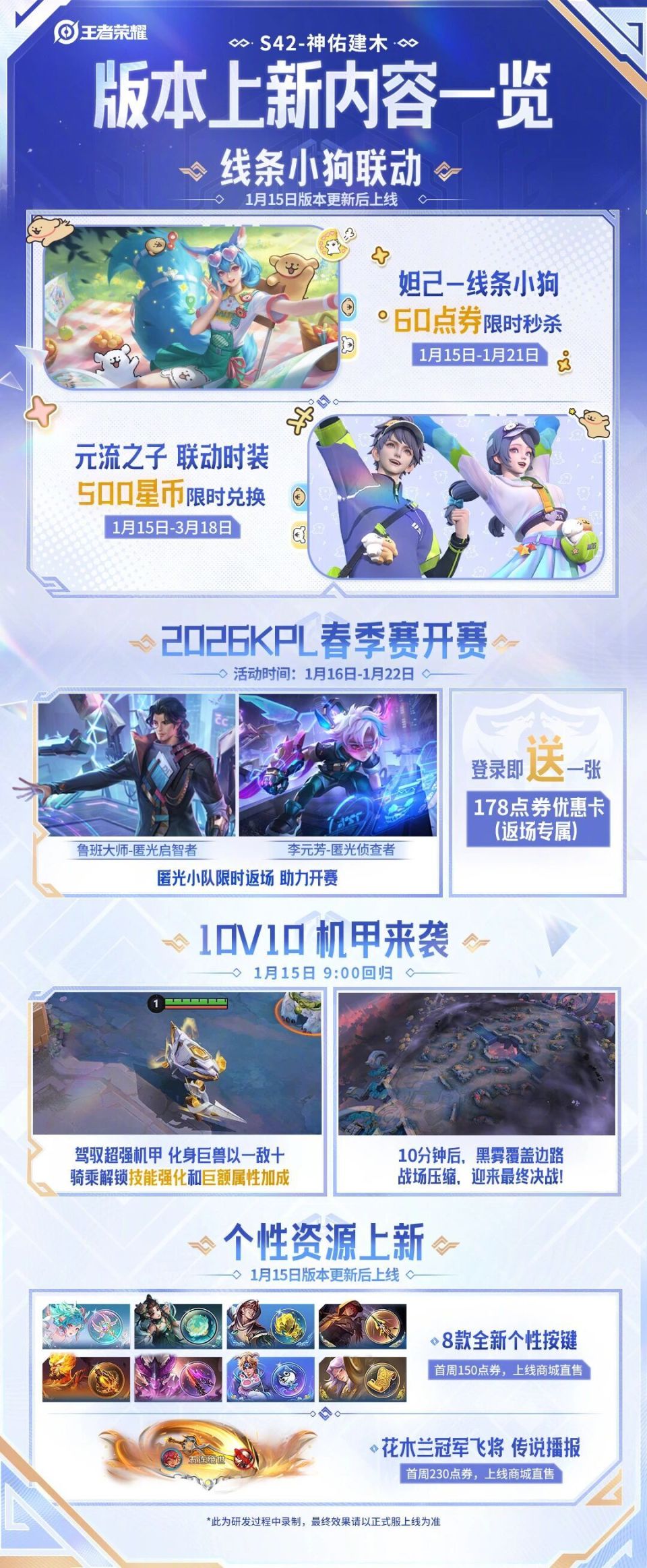 本周其他的更新内容,还有元流之子的线条小狗的联动时装,以及全新的10V10机甲玩法,还有八个全新的个性按键和一个新的传说播报。这个传说播报是花木兰的FMVP皮肤冠军飞将的。