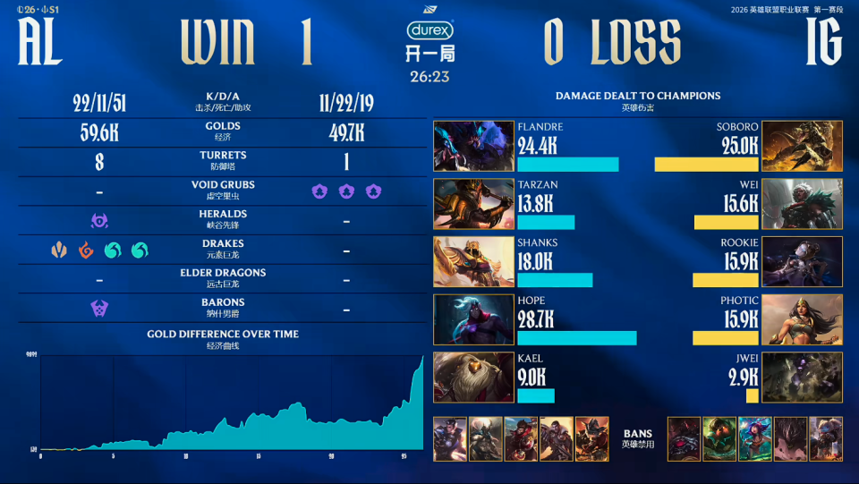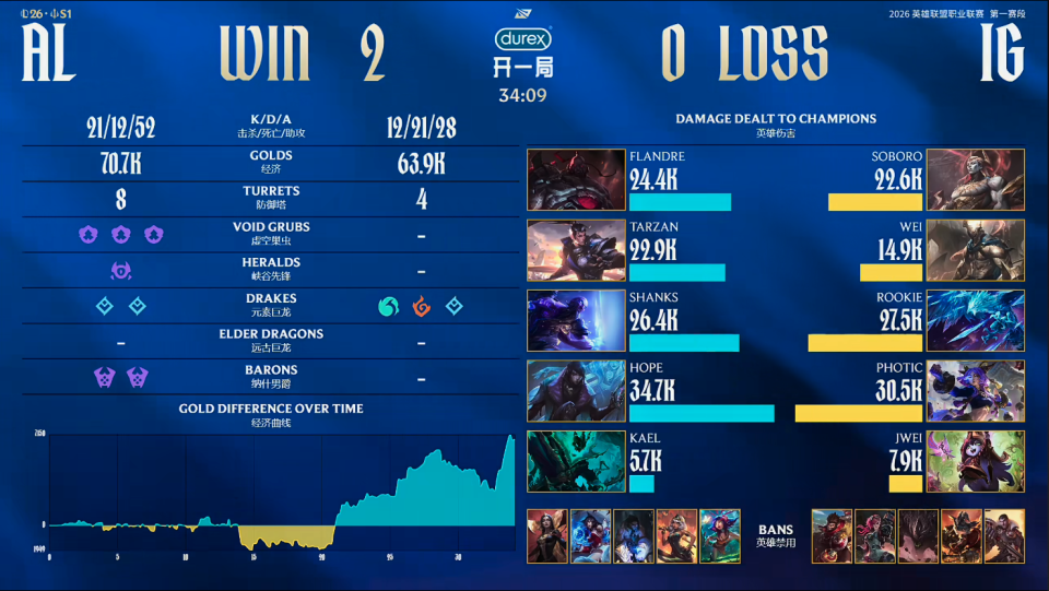 最终AL丝毫不给前世界赛冠军面子,零封了IG,送给了他们两连败,自己则是斩获了自己的首胜,也算是一个好的开始。