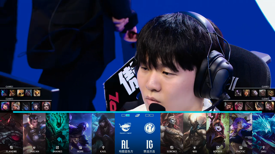 第一局比赛,AL蓝色方,禁用:兰博;杰斯;猴子;潘森;赵信,选用:Flandre雷克赛;Tarzan皇子;Shanks沙皇;Hope韦鲁斯;Kael巴德;IG红色方,禁用:波比;石头人;妮蔻;泰坦;塞恩,选用:Soboro鳄鱼;Wei狼母;Rookie发条;Photic希维尔;Jwei牛头