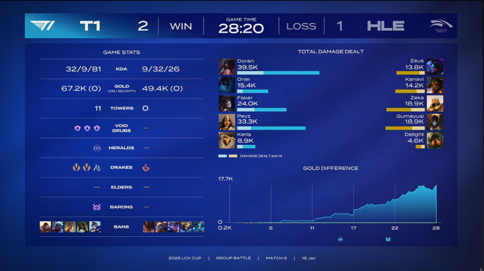 结果第一局比赛,双方各打了半场好局,HLE凭借Gumayusi的超神发挥,笑到了最后。比赛前期,T1多次针对上路,开场12分钟,抓死四次Zeus;比赛第26分钟左右,Kanavi蔚先手强开Peyz卢锡安,Gumayusi飞机三杀帮助HLE打出1换4大胜拿下大龙;比赛第29分钟左右,Faker面对HLE全队追击反手单杀Zeka岩雀;最终36分44秒,HLE团灭T1,先赢一局!