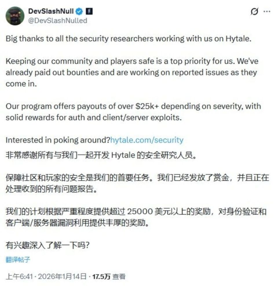 据悉,玩家可直接向《Hytale》安全团队提交漏洞报告。一旦问题被核实并符合赏金资格,团队将进行评估并持续向报告者同步修复进展。