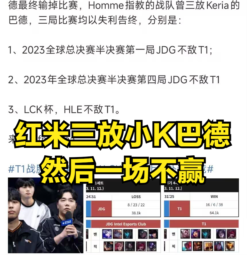但是随着HLE跟T1的焦点之战结束后,HLE打野kanavi和教练红米也是“身败名裂”,不少观众都认为HLE买入kanavi和红米就是“冤大头”。尤其是HLE教练红米在跟T1的生死局BP当中,竟然在前三手放给T1打野梦魇中单发条以及辅助巴德的绝活阵容。不少LCK粉丝都认为,教练红米在LPL待久了,已经不契合LCK的比赛节奏。而教练红米也是深夜发文给粉丝们道歉,红米认为是自己的BP失误,导致HLE输给T1。