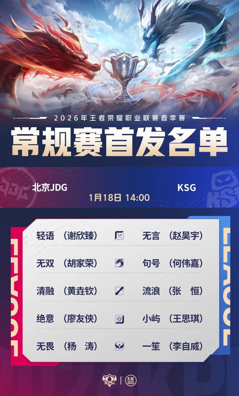 同样在上场比赛旗开得胜的北京JDG和KSG赛场相遇,北京JDG.无双(胡家荣)和KSG.句号(何伟嘉)首次联赛交锋,强强对决,谁能延续胜势再下一城?