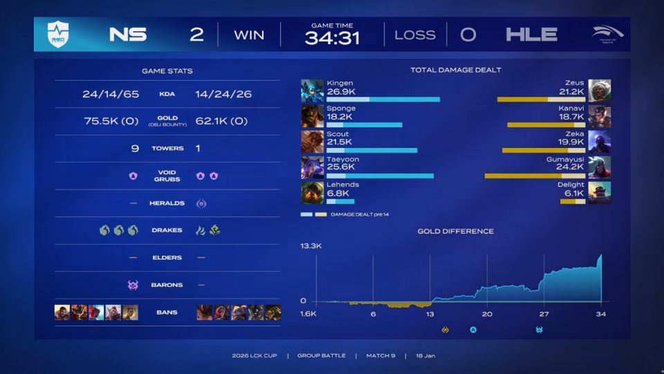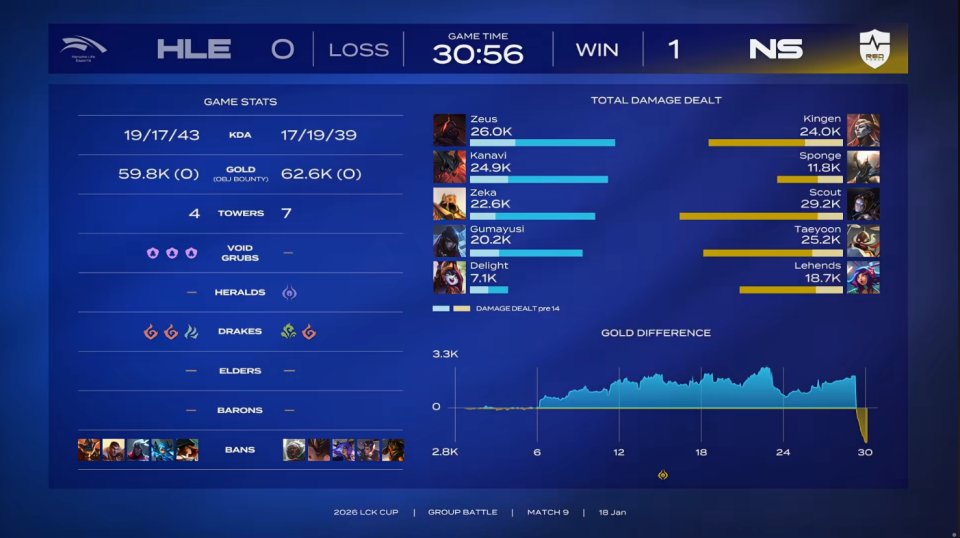 结果第一局比赛,NS上演惊天逆转,最后时刻翻转HLE。比赛前期HLE连续针对Scout发条得手;比赛第18分钟左右,HLE打出1换2后一度取得主动,但NS成功咬住经济差;比赛第23分钟左右,Kanavi剑魔带头追击被反打,Leheneds妮蔻大四个帮助NS打出2换3;比赛第27分钟左右,HLE打出1换2后开打大龙被NS打出4换3守住;比赛第29分钟,Scout发条开大秒掉Gumayusi厄斐琉斯,NS打出1换5后一波击溃HLE;最终30分56秒,NS逆转HLE,先赢一局!