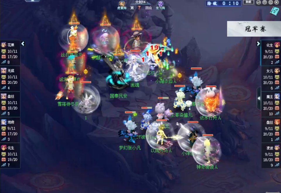 比赛第7回合,苏堤春晓乘胜追击,靠着凌波城的伤害继续压制紫禁城召唤兽。不过,此时的紫禁城已经全员立盾,苏堤春晓虽有面伤优势,但很难击穿紫禁城防线。