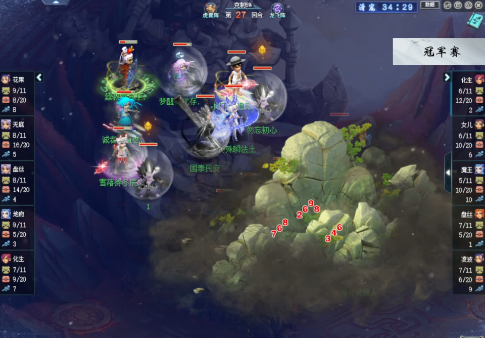 比赛第27回合,苏堤春晓刚刚拉起凌波城,就被紫禁城用花果山和须弥法宠补刀。只能说,这个时候的苏堤春晓,不仅无法组织有效面伤进攻,就连拉人也成了一个问题。