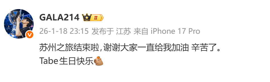 虎扑01月18日讯 2026LPL第一赛段常规赛JDG以2-1的比分战胜AL,赛后GALA发文: