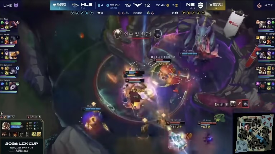 比赛进行到12分钟,HLE已经领先2K经济了,Kanavi的剑魔3-0开局,只要正常打的话,HLE是输不了的,但看片后续团战发狂了,13分钟下路河道爆发团战,Kanavi开大一打3,给Scout送了个大头,后续先锋团,Kanavi再次发狂,又冲上去1打3,结果这波又阵亡了,先锋也被NS拿下。