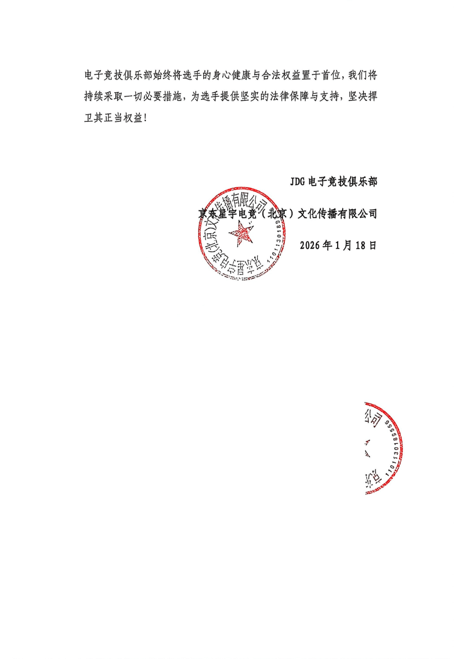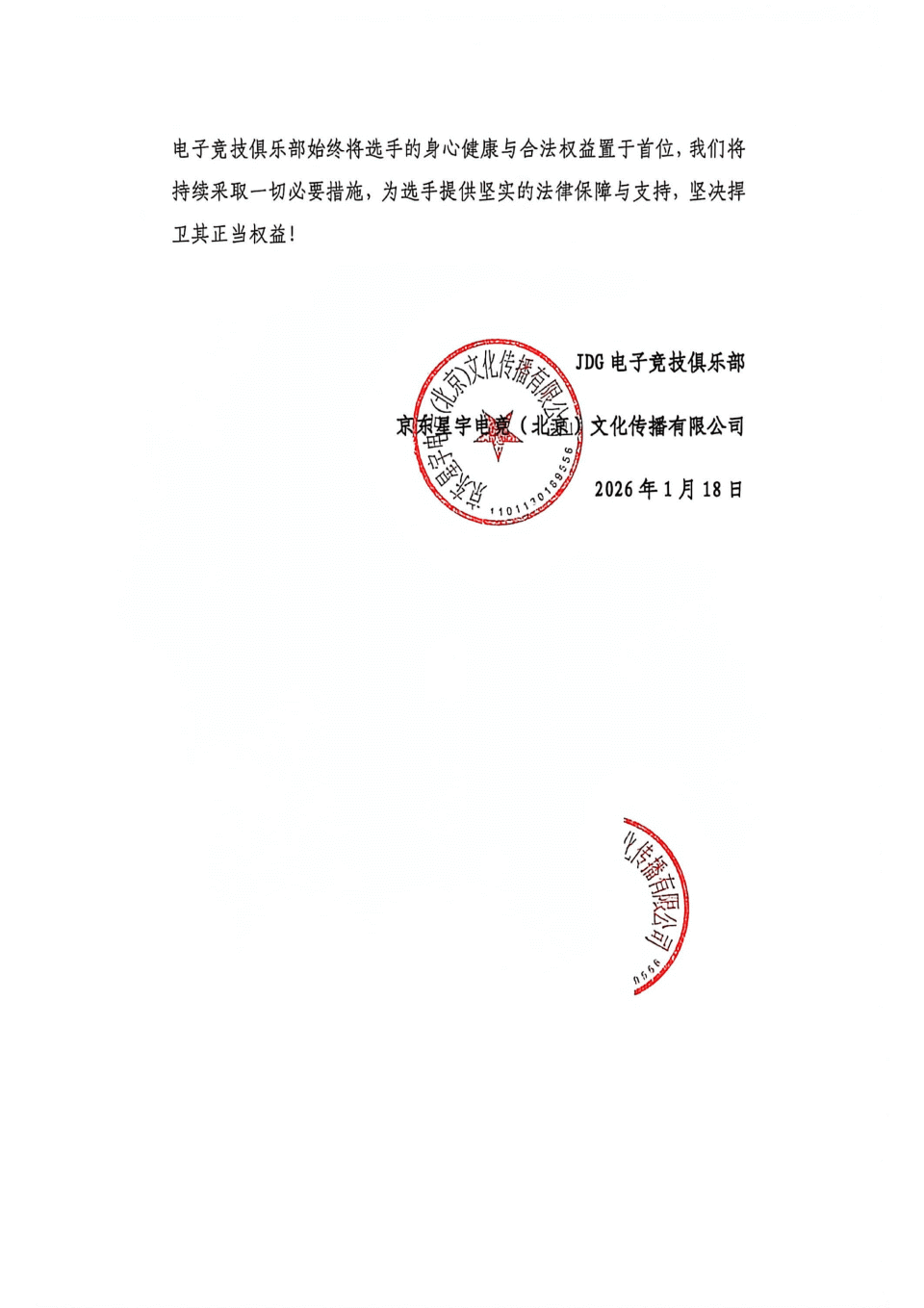 北京JDG电子竞技俱乐部始终将选手的身心健康与合法权益置于首位,我们将持续采取一切必要措施,为选手提供坚实的法律保障与支持,坚决捍卫其正当权益!