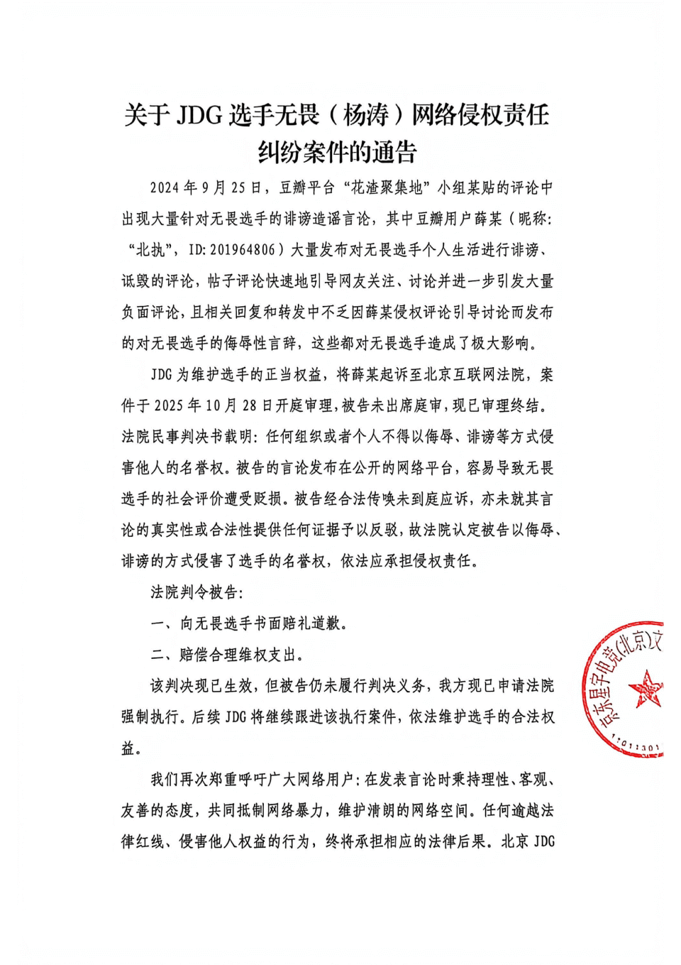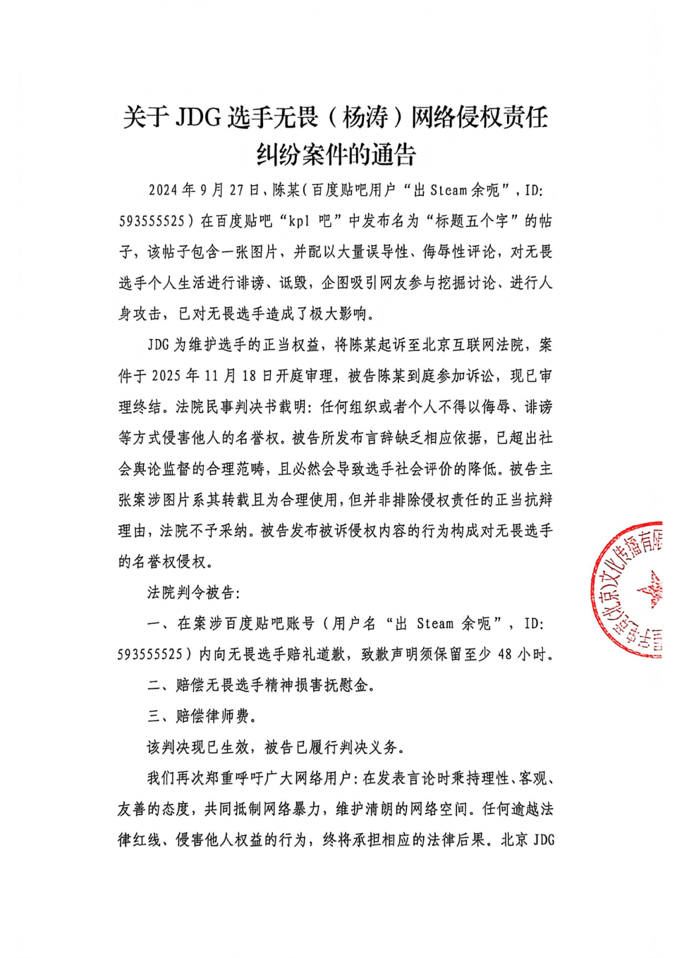 针对一直以来各平台相关网络用户发布侮辱言论、恶意造谣等诋毁杨涛选手公众形象并严重侵犯杨涛选手合法权益的行为,北京JDG电子竞技俱乐部一直密切关注并持续跟进,今日就部分案件最新进展,特此发布《关于JDG.无畏(杨涛)网络侵权责任纠纷案件的通告》: