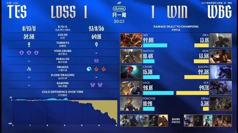 第一局比赛,WBG蓝色方,禁用:杰斯;兰博;发条;皇子;狼母,选用:Zika奎桑提;Jiejie猴子;Xiaohu辛德拉;Elk烬;Erha蕾欧娜;TES红色方,禁用:石头人;妮蔻;妖姬;纳尔;洛,选用:369鳄鱼;naiyou波比;Creme沙皇;JiaQi韦鲁斯;Fengyue泰坦