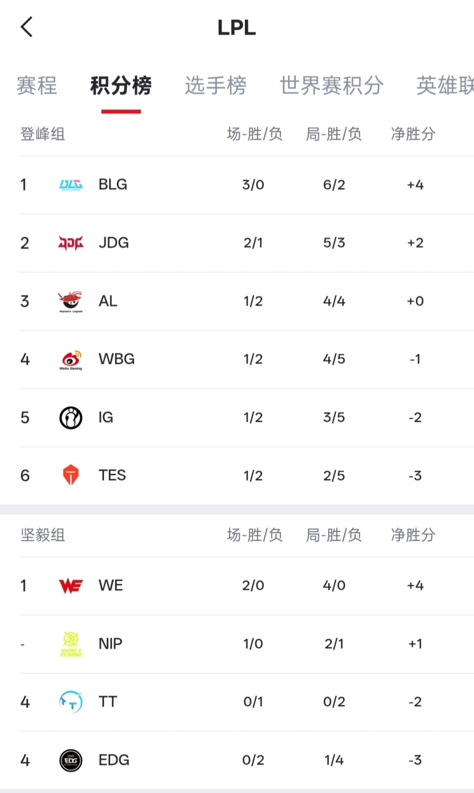LPL战队排名变化:TES拿到赛季首胜,因小分关系WBG跌至第四