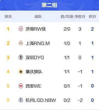 来到2组,挑战者杯亚军RW两战两胜排名第一,排在第二位的队伍是久哲带领的新RNGM,至于多冠王重庆狼队,则仅仅只排在了第四名。