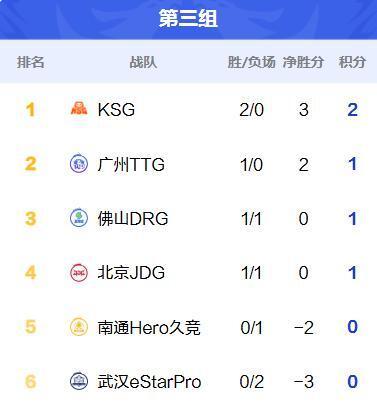 来到三组后,排在第一的队伍是KSG,作为联赛目前唯一没有城市冠名的队伍,本赛季的KSG继续在阵容上发力,换上了更加年轻的阵容体系,事实是效果也非常不错,句号和KSG甚至打赢了老东家北京JDG。