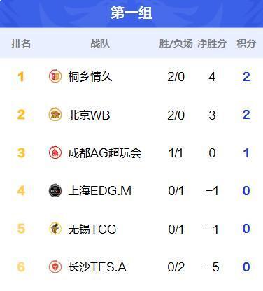 在1组,桐乡情久、北京WB分别手握两个积分,虽然大比分相同,但情久胜在小分更多一分,也正是凭借这一小分,情久成为1组榜首,但成都AG的成绩却比较一般,只有1胜1负,净胜分为0。