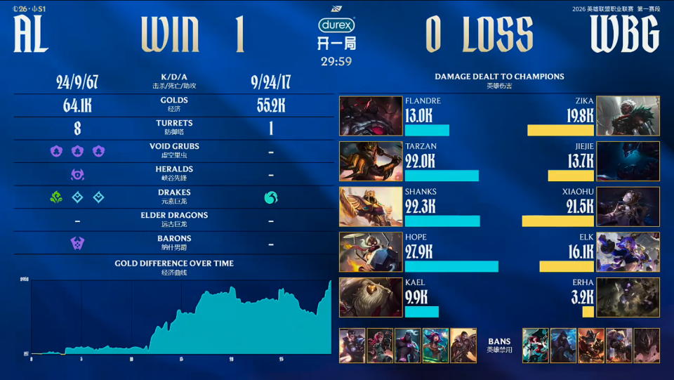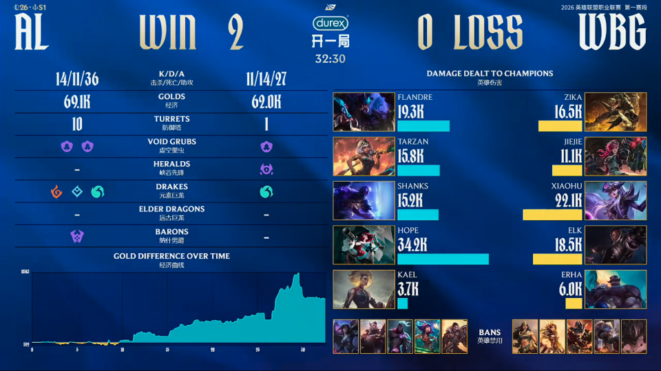 结果第一局比赛,AL打出了单方面的碾压局。比赛第11分钟左右,WBG抓掉Shanks沙皇,但Tarzan皇子带头反打1换4大胜WBG;比赛第14分钟左右,Xiaohu发条再度阵亡来到0/4。AL打出1换3大胜;比赛第18分钟左右,Tarzan皇子游龙帮助AL再度反打一波1换4大胜;比赛第28分钟左右,Hope飞机砍下三杀,AL一波打出0换3大胜WBG;最终比赛第29分59秒,AL打出2换5后,一波结束比赛。