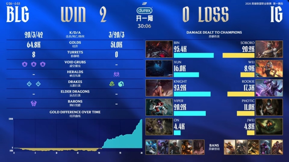 后续BLG进攻是怎么打怎么有,最终打出了20:3的人头比,2-0直接带走IG。