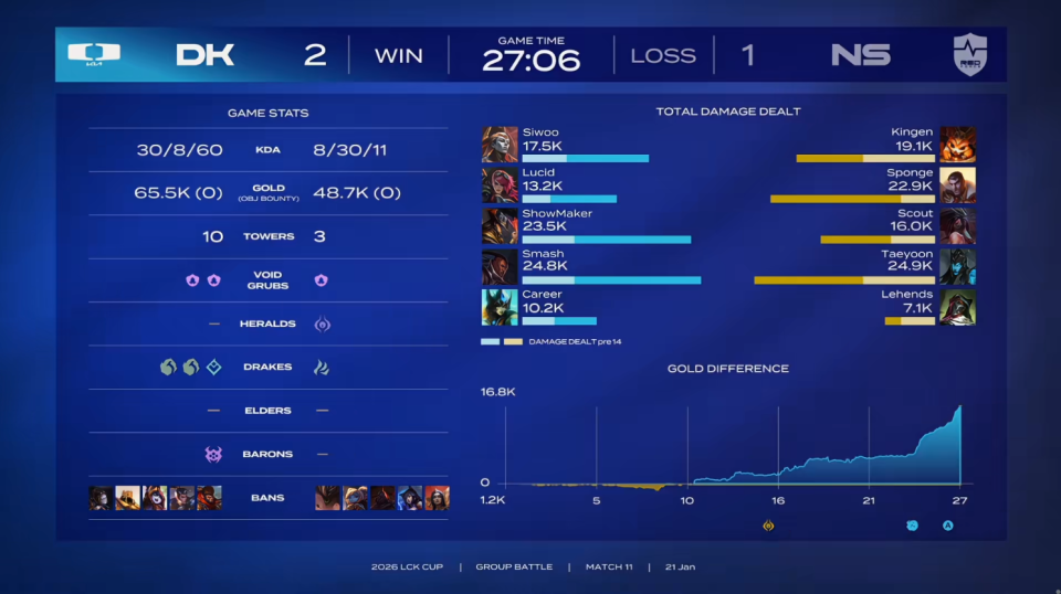 第一局比赛,DK蓝色方,禁用:发条、沙皇、杰斯、泰坦、韦鲁斯,选用:Siwoo奎桑提、Lucid皇子、ShowMaker瑞兹、Smash希维尔、Career巴德;NS红色方,禁用:石头人、芸阿娜、蔚、卢锡安、卡尔玛,选用:Kingen兰博、Sponge潘森、Scout岩雀、Taeyoon伊泽瑞尔、Lehends妮蔻