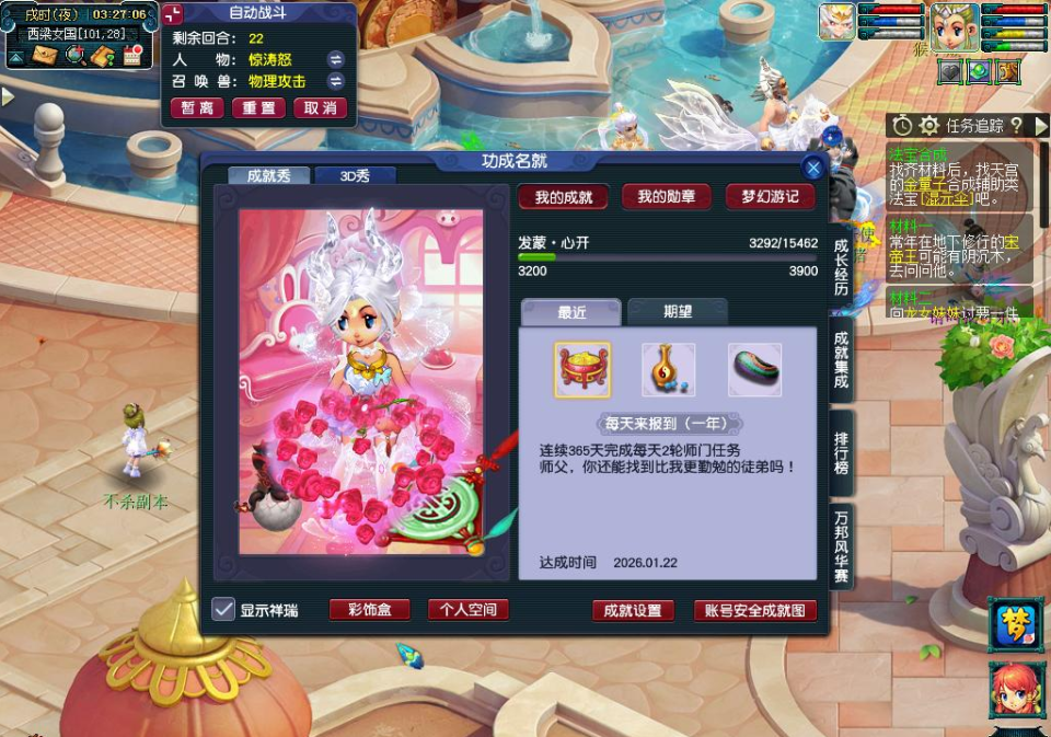 通常来说,在梦幻中衡量一位玩家能否成为毅力帝,其中一个指标是完成“一年每天来报道”这一成就。今日,【沂水雪山】一位175级玩家凭借惊人的毅力,终于达成了连续365天完成师门任务的成就!据该玩家表示,其实满级角色做师门的性价比并不高,之所以能坚持下来,主要是为了保点卡。由于经常上夜班,他大多选择在凌晨时段完成师门任务。