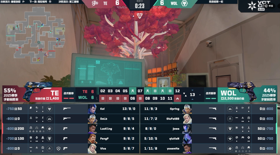 上半场第3回合qiutian回防一打二带队拿到首分。在qiutian的发挥下,狼队连下三分。第6回合FengF雷兹开大,全队直接rushA,抓到狼队的timing赢下。第8回合双方在B长博弈,狼队通过斯凯打闪反清,站住B长口赢下。第11回合狼队回防A点各自为战没有联动,被TE逐个击破赢下第4分。第12回合狼队守住B小,前后夹击将TE堵在A包点打掉赢下。上半场狼队8-4 TE。