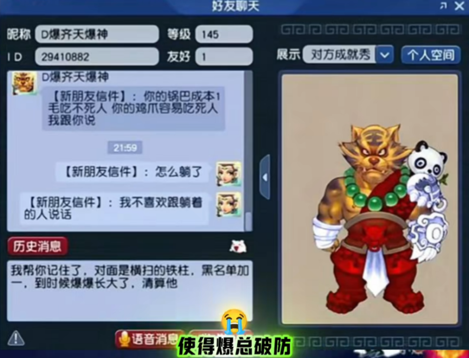 然而比赛途中,一段小插曲却点燃了爆总的斗志。对手在交锋中发出嘲讽,让他瞬间“破防”。赛后爆总公开回应,直言“未来必定清算”。这番话不禁让人回想起他当初在齐天大圣区创下的传奇——开区仅两个月,就带领队伍登上服务器冠军宝座。如今的爆总,似乎再一次被激起了那股不服输的劲头。