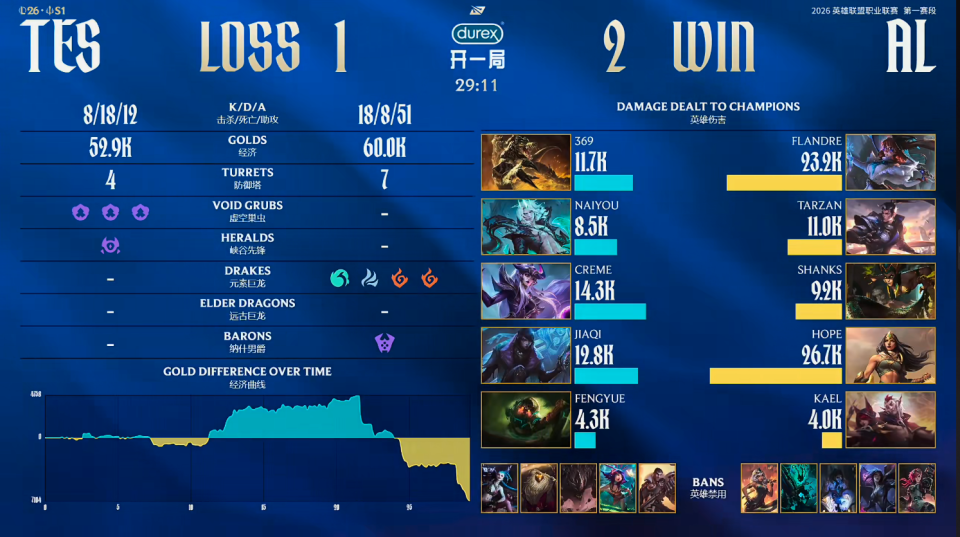 结果第一局比赛,TES在前10分钟,打了好局,可惜的是,后续事件,被AL拿捏了。2分钟左右:JiaQi飞机闪现线杀Hope芸阿娜拿到一血;9分钟左右:TES上野gank塞恩没打出击杀,潘森大招赶到收下双杀;11分钟左右:发条探草被蹲到,AL打出一换三;12分钟左右:AL野区留人再次打出一波一换三;16分钟左右:双方中路爆发团战,芸阿娜收掉巨魔后稳定输出打出一换四;17分钟左右:塞恩抓到机会下路单杀狼母;最终32分24秒:双方河道爆发团战,AL保住芸阿娜无解输出,打出一换五团灭对手后,一波结束比赛。