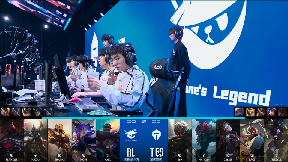 第二局比赛,AL蓝色方,禁用:杰斯,卡莎,琪亚娜,永恩,蔚,选用:Flandre加里奥,Tarzan皇子,Shanks瑞兹,Hope韦鲁斯,Kael曙光;TES红色方,禁用:石头人,妮蔻,奎桑提,巴德,波比,选用:369兰博,Naiyou猴子,Creme阿卡丽,JiaQi女枪,Fengyue芮尔