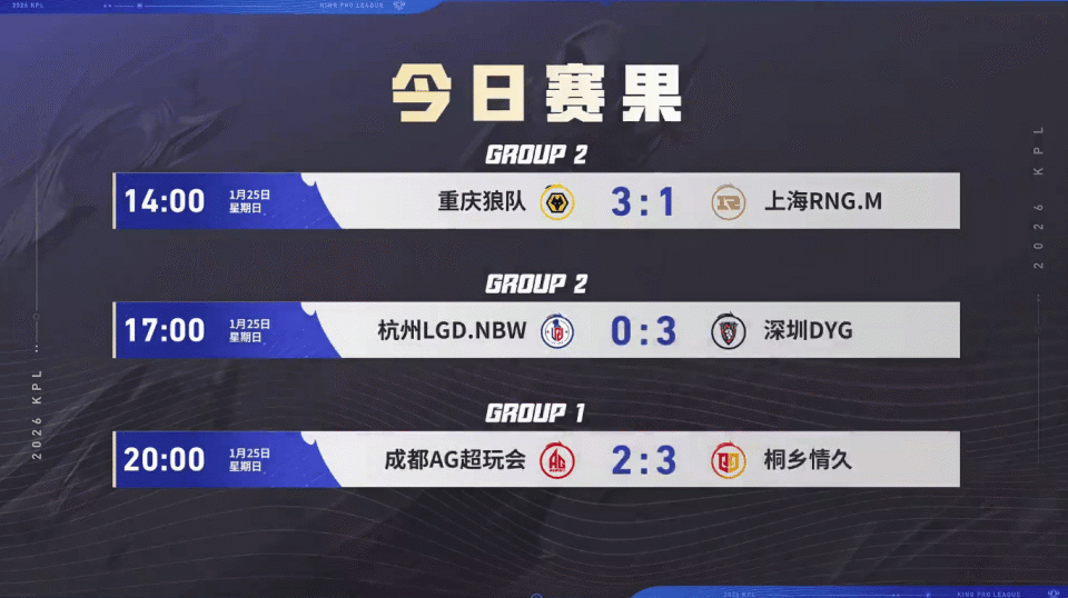 虎扑01月25日讯 [赛果]一组情久榜首,AG第四;二组DYG榜首,狼队第二