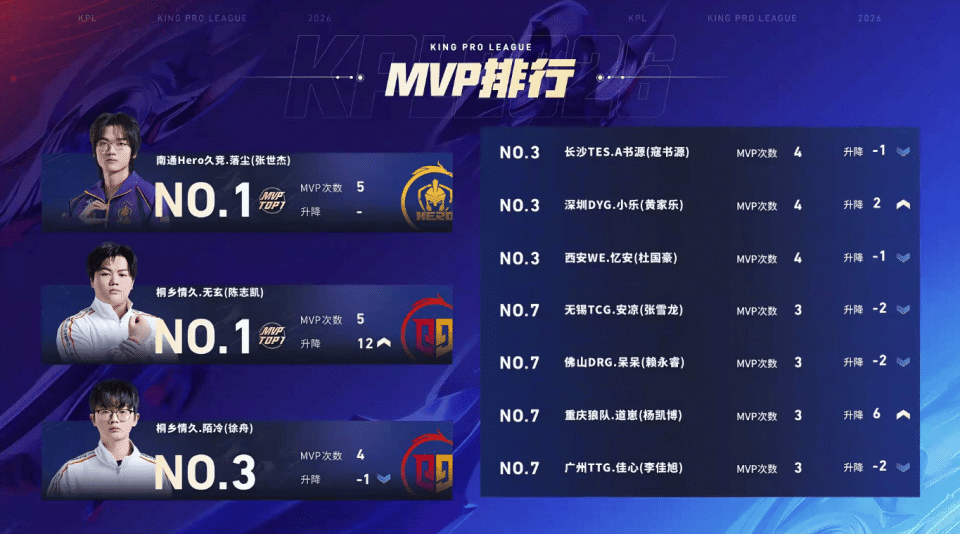 南通Hero久竞_落尘 (张世杰)、桐乡情久-无玄 (陈志凯)均累计获得5次MVP,并列MVP排行榜首;