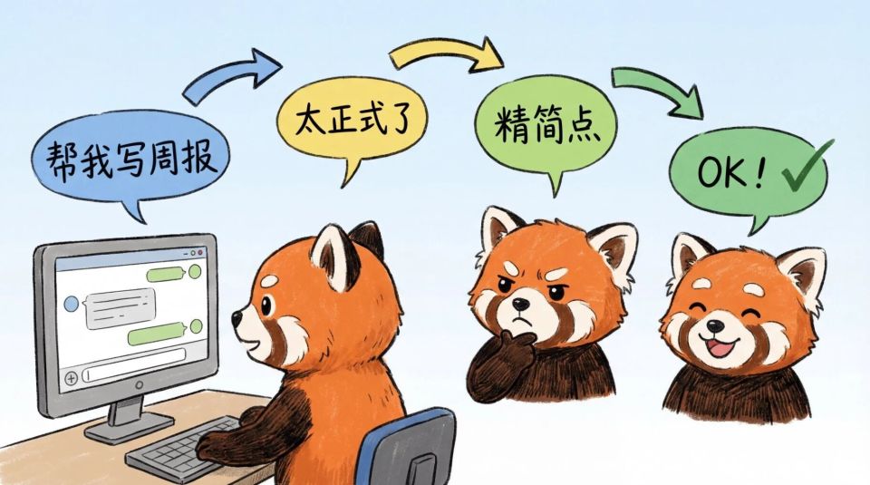 它给我写一版,我说太正式了,轻松点;它改一版,我说这段太啰嗦,精简点;它再改一版,我说这个语言风格不太像我,发几段我之前写的周报给它;来回几轮,最后得到一个满意的版本。