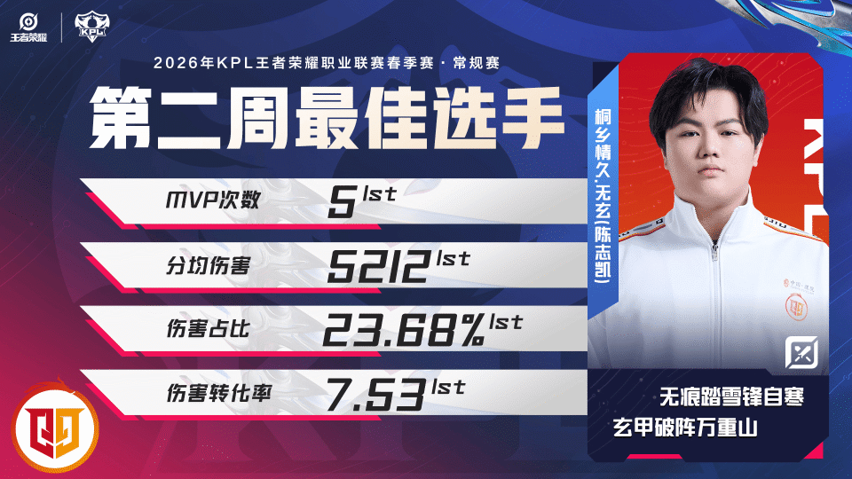 恭喜桐乡情久-无玄 (陈志凯)斩获2026年KPL春季赛常规赛第二周最佳选手!让我们共同期待他在后续比赛中的精彩表现